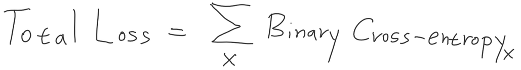 시그모이드를 사용하므로 Binary Crossentropy를 사용합니다. 여기서 각각의 레이블에 대해 손실함수를 적용하므로 멀티 레이블 분류의 경우 Loss function는 다음과 같습니다.